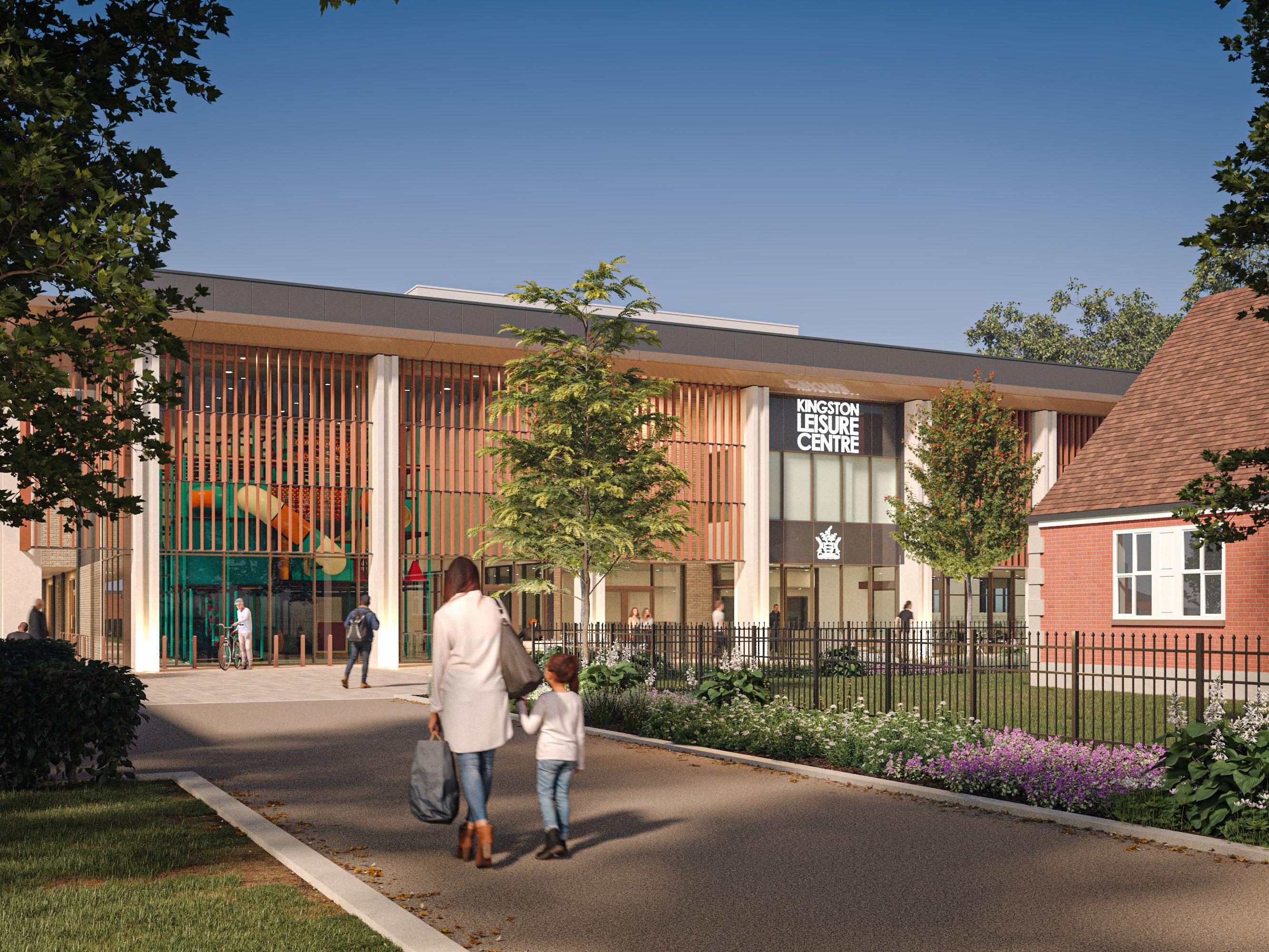 The new Kingston Leisure Centre will include a 25m, 8-lane main pool with moveable floor, a 20m learner pool with interactive splash zone, health suite with sauna and steam room, 150-station gym, group cycling studio, three activity studios, four-court sports hall, squash courts, soft play, and a café. The scheme will also improve the surrounding green space, with enhanced landscaping, new pedestrian routes and an improved play area and wildflower meadows.