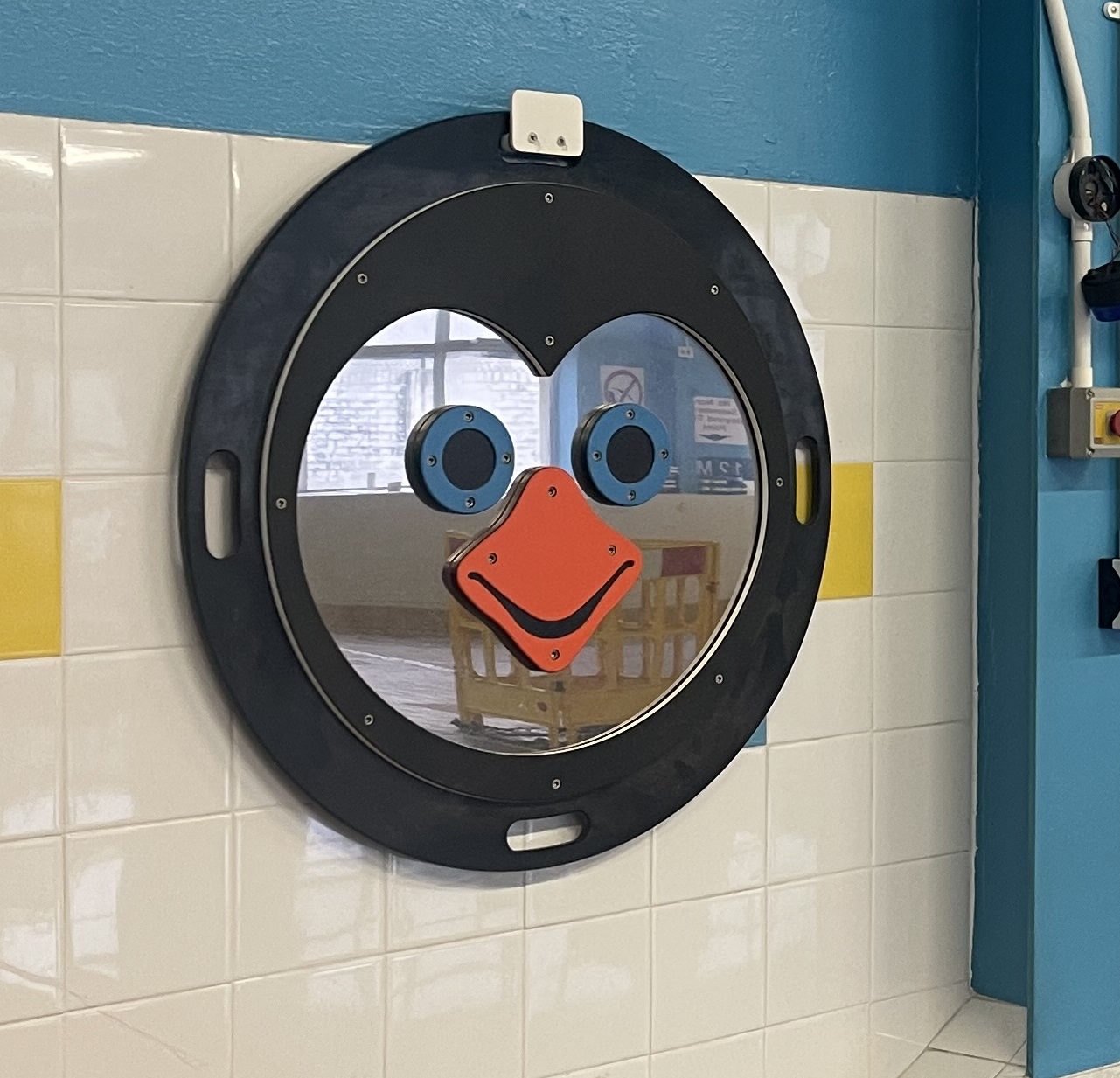 Our 750mm diameter weighted mirrors are dropped into the pool, gently sinking to the bottom. As the mirrors sink to the floor, children can swim below the surface to view one of the four friendly designs.