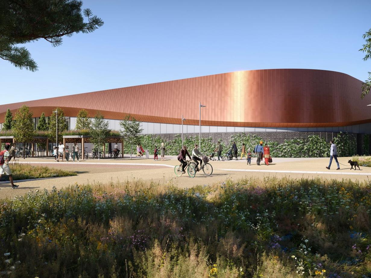 The design proposals feature light coloured, concave metal cladding, surrounding the arena level in a continuous ribbon reminiscent of cycling components.