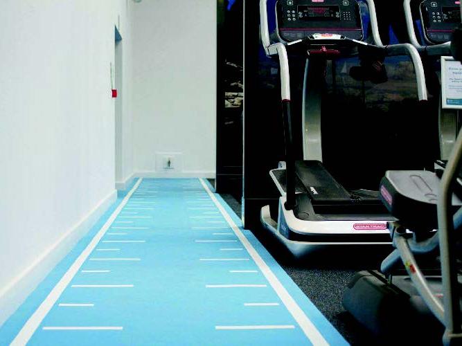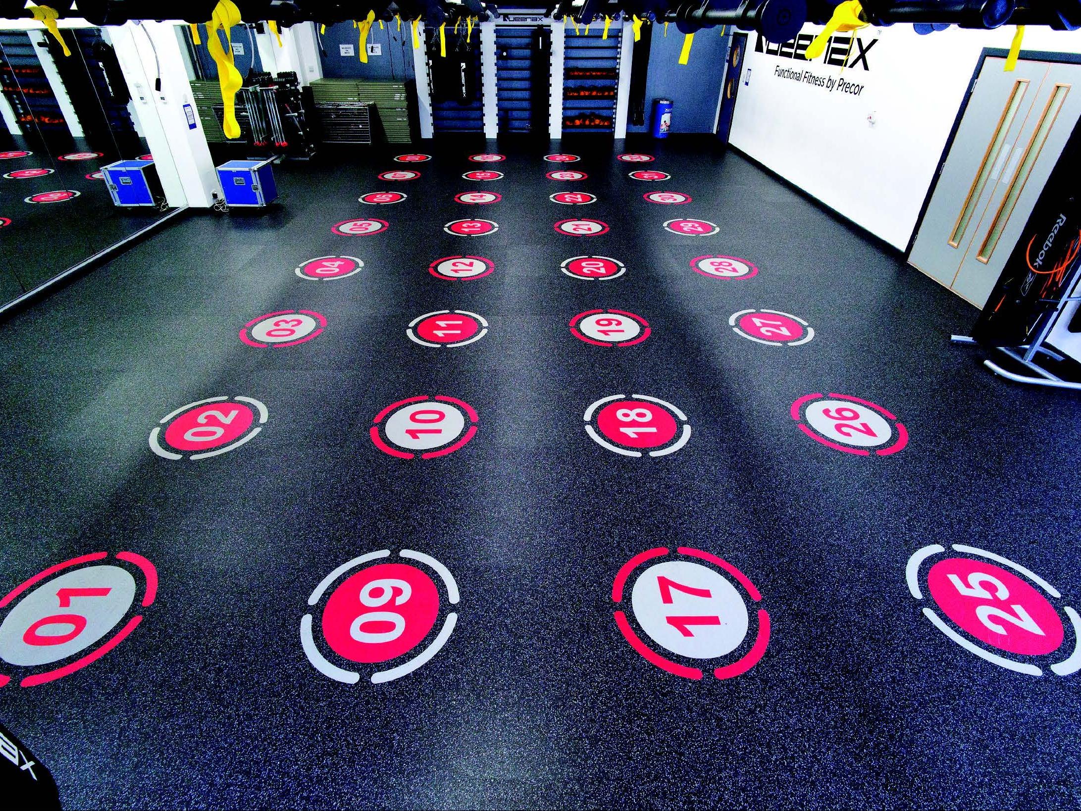 In the newly extended free weight area, a 40mm impact material was laid to reduce noise and vibration. The surface was specified in grey to complement the flooring scheme alongside it.