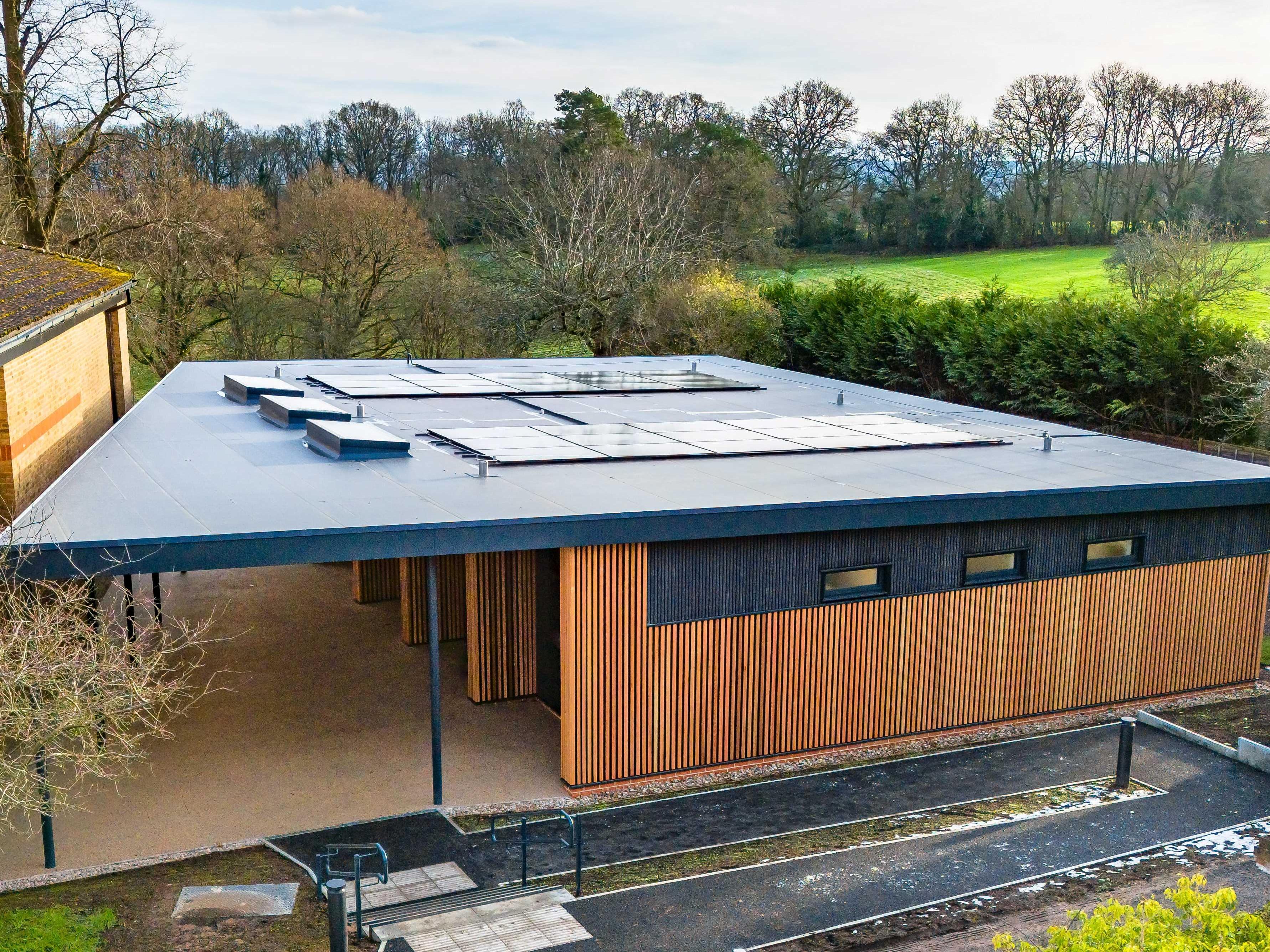Built in just five months, the building features two spacious changing rooms, each accommodating up to 54 pupils aged 9-13, complete with showers, toilets, and essential storage spaces. A large, sleek canopy seamlessly connects the new building to the existing sports hall, offering covered access in all weather conditions and much needed storage for PE equipment.