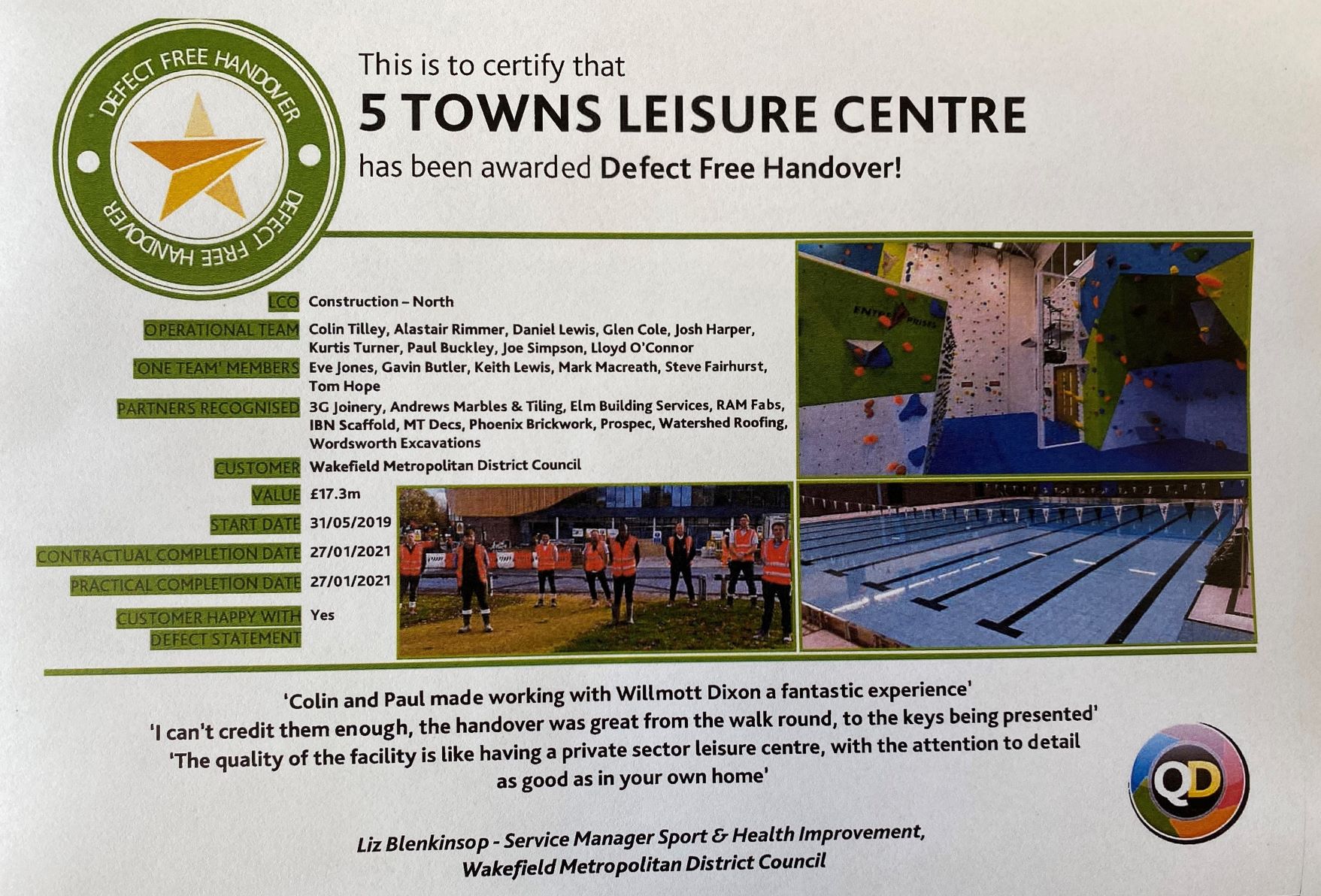 On completion of our recent Leisure Centre project partnering Willmott Dixon, Prospec were jointly awarded “Defect Free” status. This prestigious award reflects Prospec’s commitment to not only delivering our projects on time and in full, but also to our working relationships, delivering above and beyond our partners expectations!