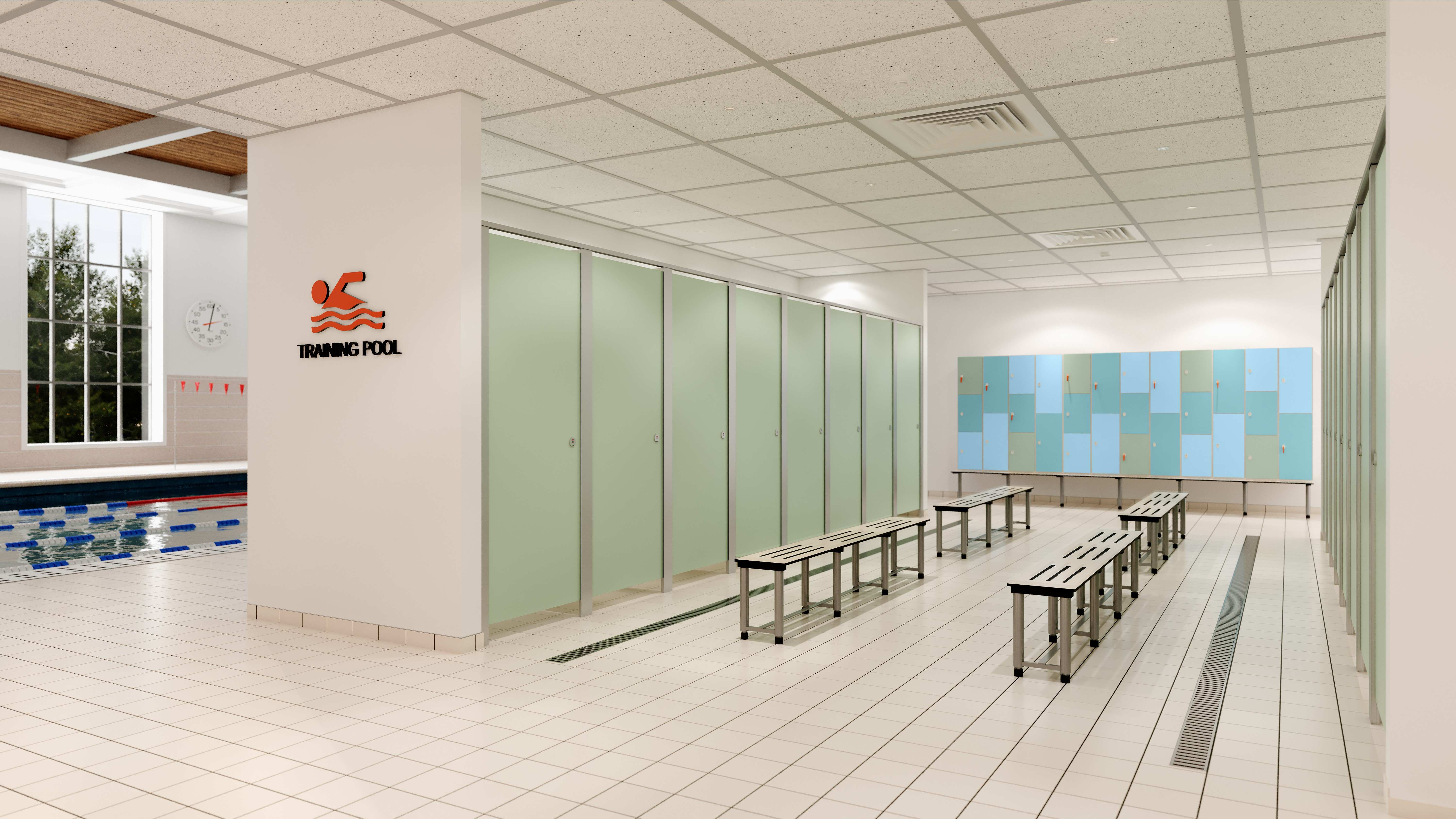 Leisure washrooms and changing areas are used intensively, particularly at peak times. Cubicles, lockers, and benching are regularly subjected to rough treatment with knocks from bags, equipment, and doors as users move quickly through the space.
